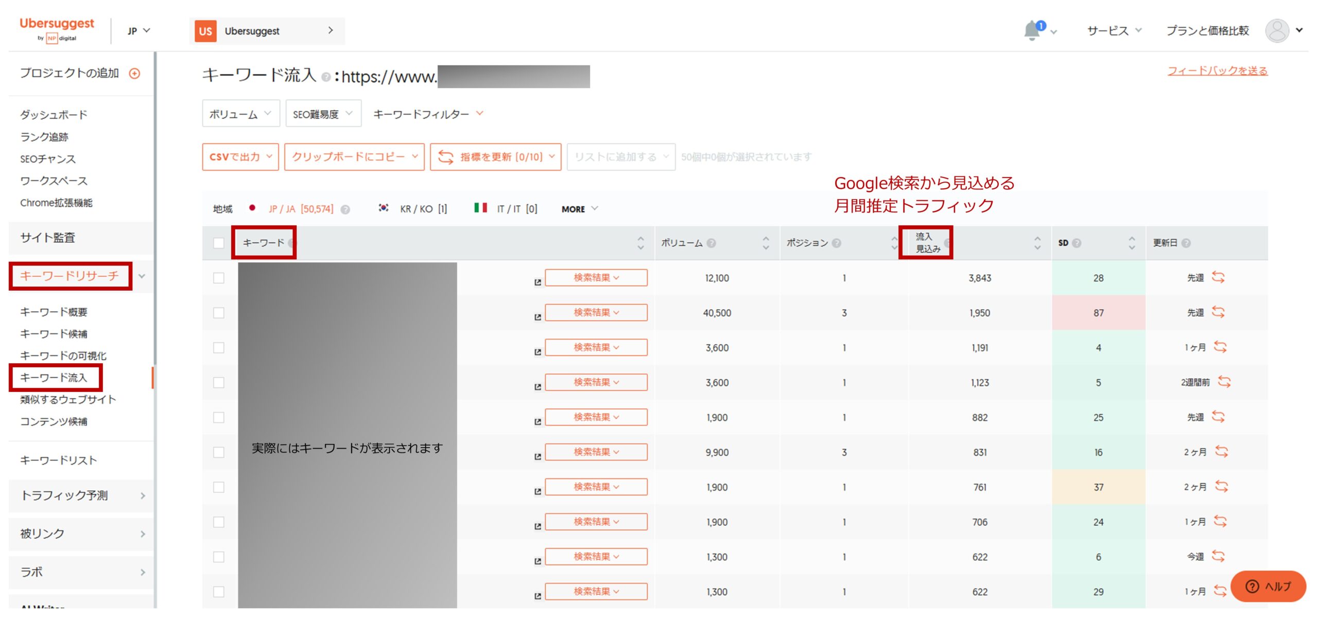 流入キーワードと流入数はUbersuggest(ウーバーサジェスト)で確認できます。(今すぐUbersuggestの解説を読む)