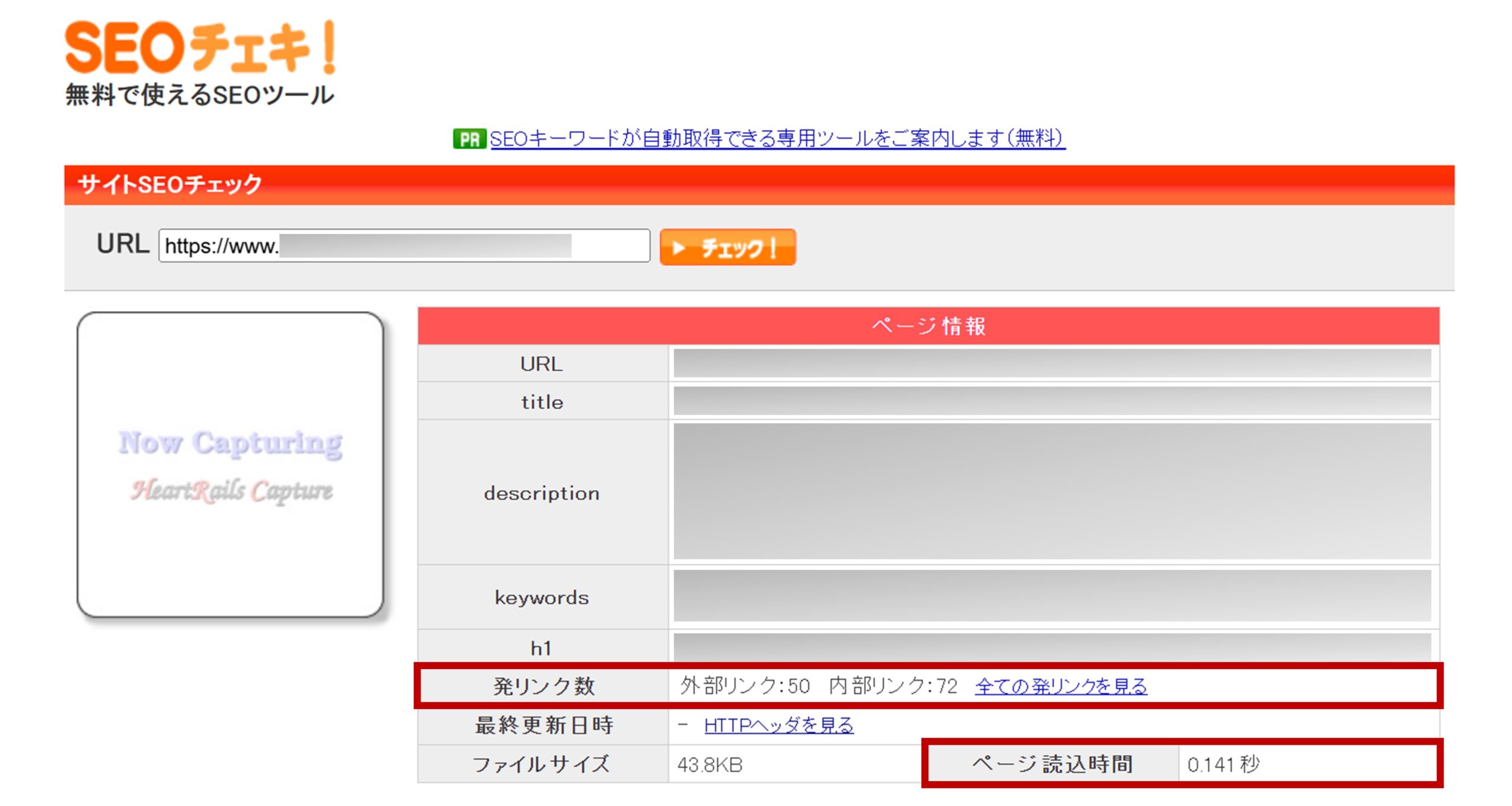上記4項目中の1項目だけリサーチしたい場合は、他のツールよりSEOチェキ!を使ったほうがすばやく調べられます(手順はURLを入力し「チェック」をクリックするだけ)。