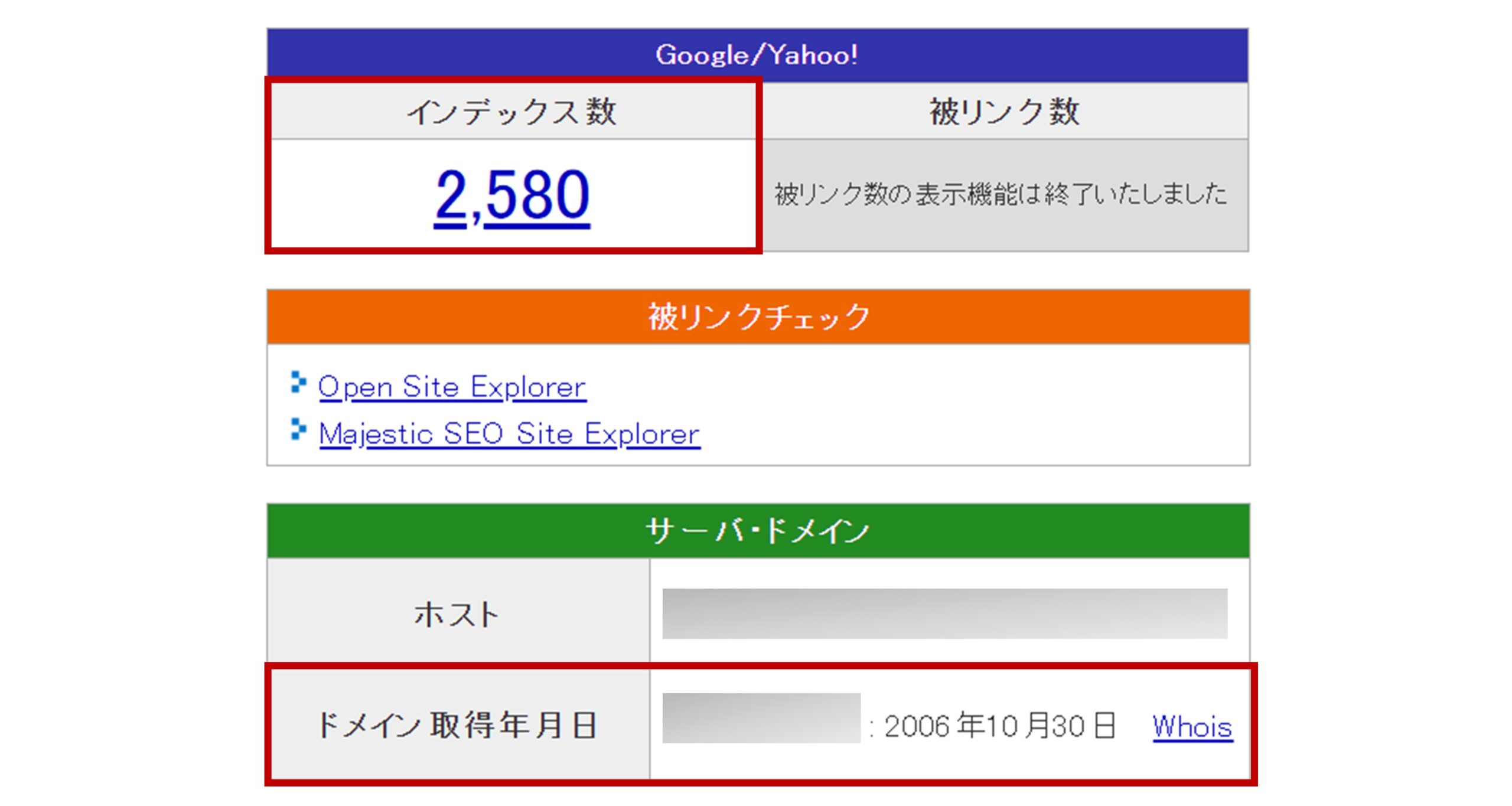 SEOチェキ!のリサーチ結果画面(インデックス数・ドメイン取得年月日)